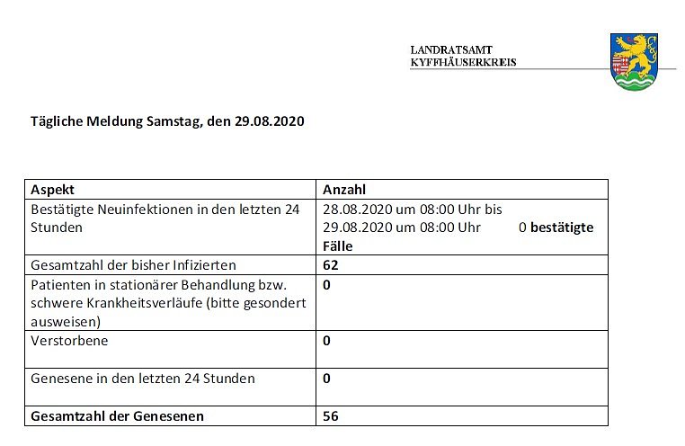 Hier die tägliche Corona-Meldung aus dem Landratsamt Kyffhäuserkreis...