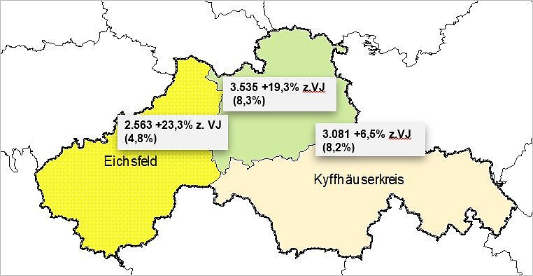 Am stärksten wirke sich die Situation in den Landkreisen Nordhausen und Eichsfeld aus. In Nordhausen liegt die Arbeitslosenquote erstmals über dem Kyffhäuserkreis. Vor allem in Teilen des verarbeitenden Gewerbes habe man hier aktuell eine schwierige Lage. Der ländlich geprägte Kyffhäuserkreis mit vorwiegend klein- und mittelständischen Unternehmen hingegen bekäme die Auswirkungen nicht so stark zu spüren.