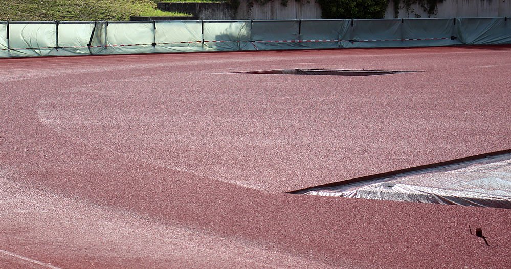 Die erste Schicht wurde hier am Südbogen bereits von Mitarbeitern der Fa. Polytan beschichtet. Das Ganze nennt sich Re-Topping.