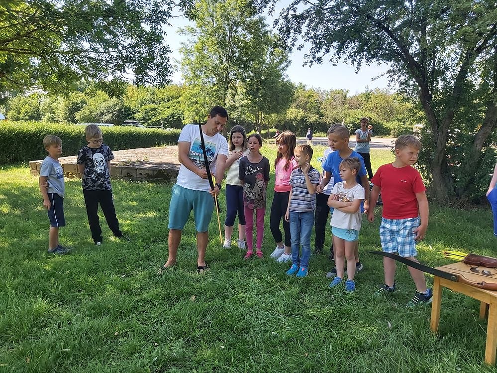 Alle Räder wurden gecheckt und wenn nötig repariert und die Kinder wurden mit einem Fahrsicherheitstraining und einem Quiz fit gemacht. Danach waren alle bereit die Umgebung mit dem Rad zu erkunden und nebenbei noch Bogenschießen zu lernen oder die Burg Wendelstein zu erobern. In der 2. Woche stand der obligatorische Besuch in der Kegelbahn an. Unter dem Motto Wald und Wiese lernten die Kinder den Rabenswald und Hermannseck kennen. Außerdem stürmten sie den Aussichtsturm der Arche Nebra.