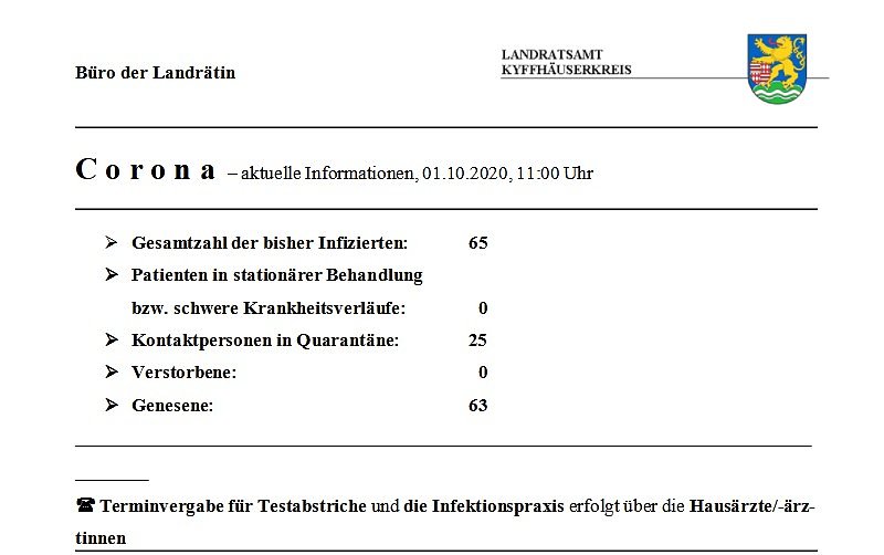 Derzeit werden im Kyffhäuserkreis 2 positiv SARS-CoV-2 getestete Personen (beide aus dem Altkreis Artern) betreut.