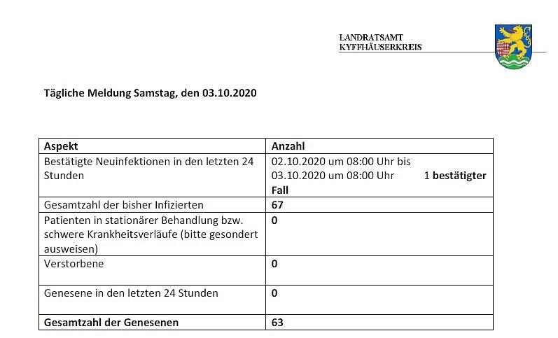 Hier die tägliche Corona-Meldung aus dem Landratsamt Kyffhäuserkreis...