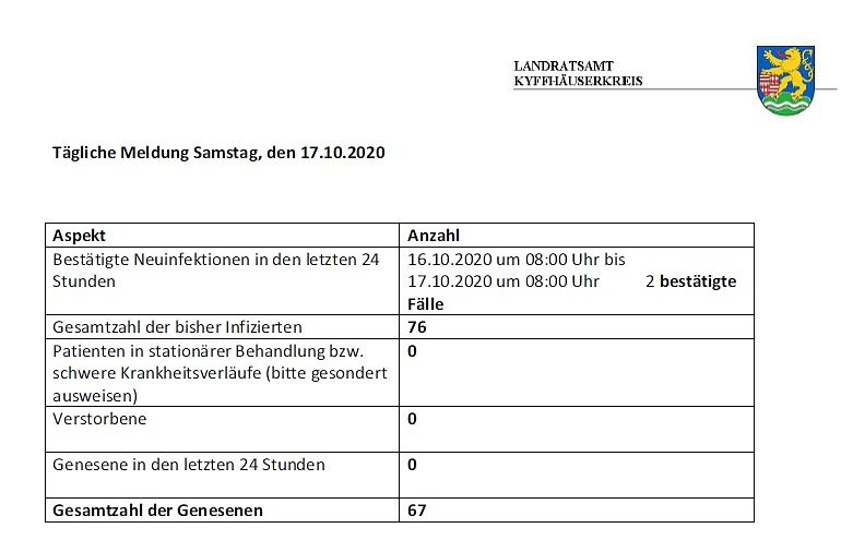 Hier die tägliche Corona-Meldung aus dem Landratsamt Kyffhäuserkreis...