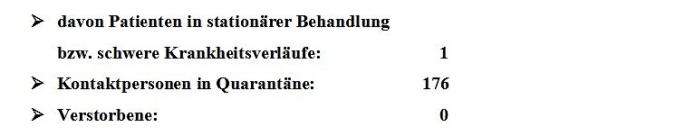 Durch das Gesundheitsamt werden 176 Kontaktpersonen betreut (73 aus dem Altkreis Sondershausen und 103 aus dem Altkreis Artern).
