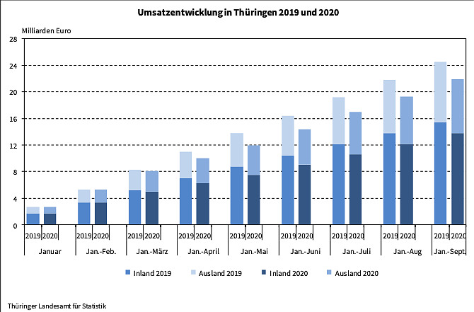 Die Thüringer Industrie erzielte in den ersten 9 Monaten 2020 rund 21,9 Milliarden Euro Umsatz. Wie das Thüringer Landesamt für Statistik mitteilt, lagen die Umsätze (bei 2 Arbeitstagen mehr) in den Industriebetrieben mit 50 und mehr Beschäftigten um 10,5 Prozent bzw. 2,6 Milliarden Euro unter dem Vorjahreszeitraum...