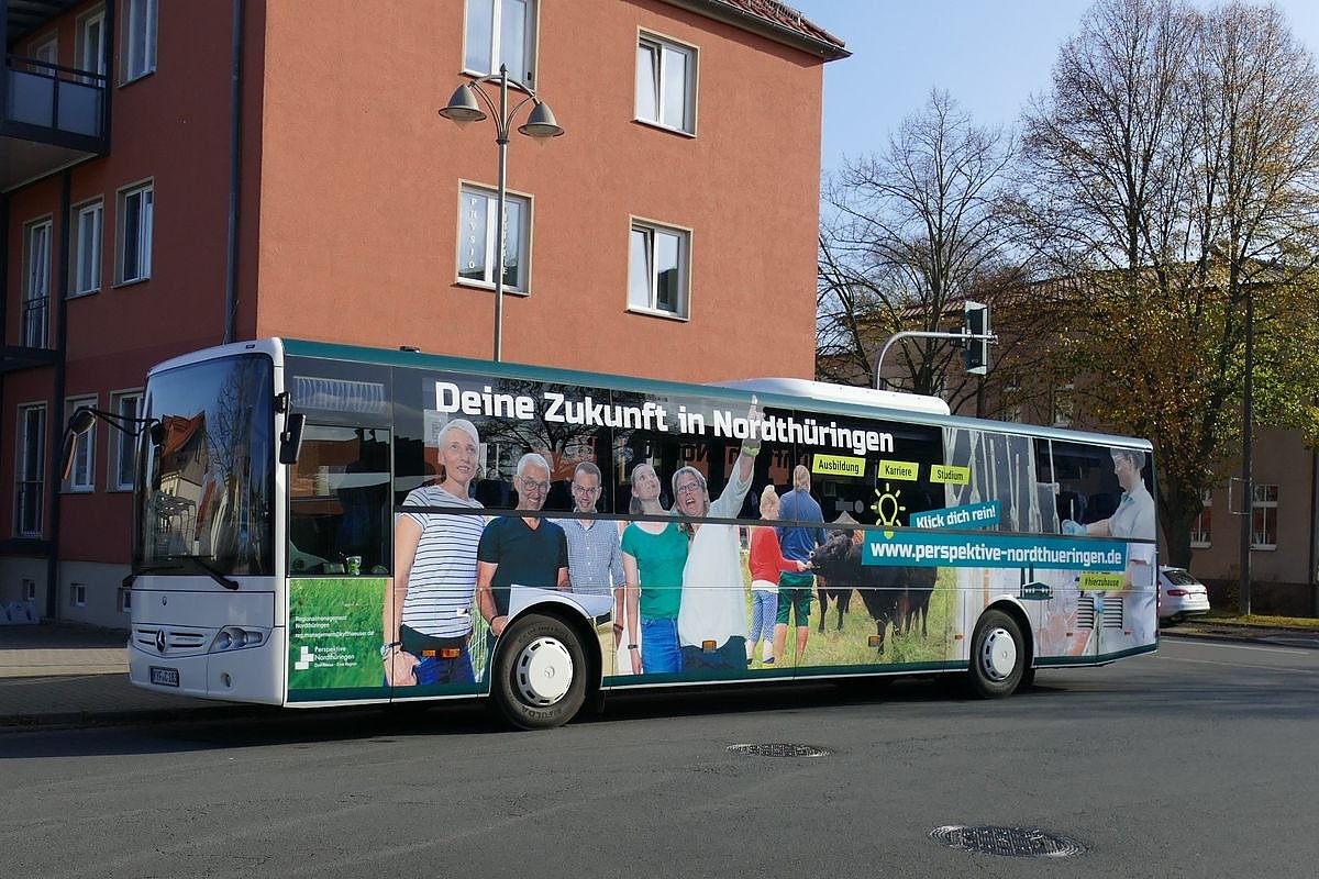 Zentral auf beiden Längsseiten des Regionalbus fällt den zahlreichen Fahrgästen an Haltestellen sowie Passanten unterwegs der Schriftzug www.perspektive-nordthueringen.de auf. Dahinter verbirgt sich die neue Internetpräsenz des Regionalmanagements Nordthüringen, das schon seit 2017 in der Region als Perspektive Nordthüringen aktiv ist. Passend zum Slogan deine Zukunft in Nordthüringen wurden Motive von Menschen und ihren Tätigkeiten in der Region Nordthüringen ausgewählt - so vielfältig und lebendig, wie Nordthüringen eben ist.