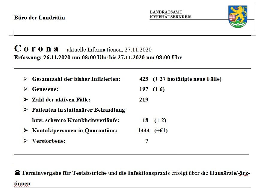 Hier die tägliche Corona-Meldung aus dem Landratsamt Kyffhäuserkreis...