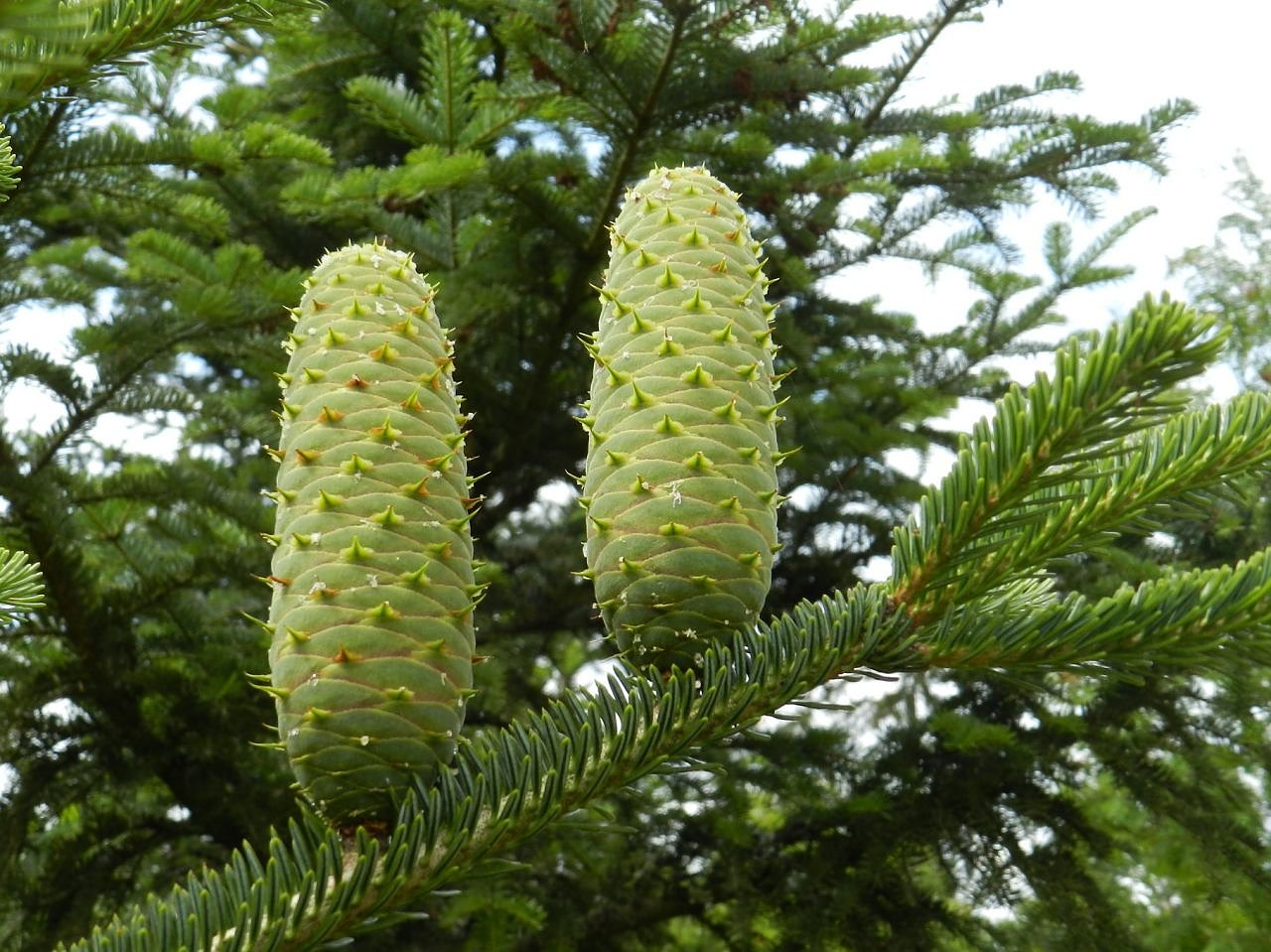 Die stehenden Zapfen einer Weißtanne: Die Zapfen zerfallen am Ast bis zur Spindel und geben den leichten Samen aus großer Höhe für den Windtransport frei. (Foto: Karina Kahlert)