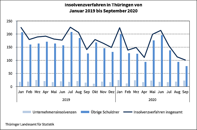 Zwischen Januar und September 2020 entschieden die Thüringer Amtsgerichte über 1405 Insolvenzverfahren. Das waren nach Mitteilung des Thüringer Landesamtes für Statistik insgesamt 311 Anträge bzw. -18,1 Prozent weniger als im Vorjahreszeitraum...