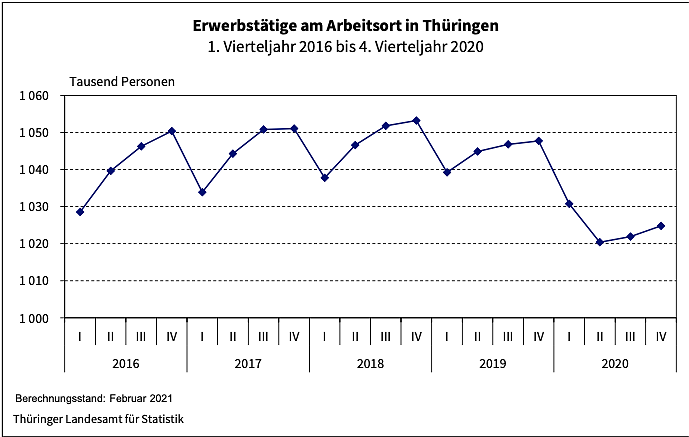 Im 4. Quartal 2020 hatten im Durchschnitt 1 024 800 Personen einen Arbeitsplatz in Thüringen. Das waren nach Mitteilung des Thüringer Landesamtes für Statistik 22 900 Personen bzw. 2,2 Prozent weniger als im 4Vorjahreszeitraum...