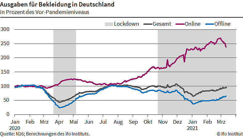 Deutsche Verbraucher gewöhnen sich zunehmend daran, Bekleidung sowie Haushaltswaren und -geräte im Internet zu kaufen. Das ist das Ergebnis einer aktuellen Auswertung des ifo-N26-Wirtschaftsmonitors. Die Forscher verglichen Offline- und Onlinekäufe 2020/2021 zur Situation vor der Pandemie...