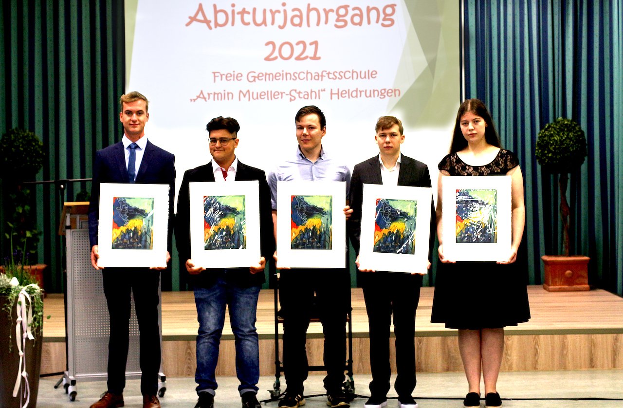 Von den Namensgeber der Schule, Armin Mueller-Stahl, schickte den Absolventen eine Grußbotschaft und limitierte und handsignierte Originalfarbradierungen: Ich bin sehr stolz auf die Abiturienten und die Lehrer der Freien Gemeinschaftsschule in Heldrungen, die meinen Namen trägt. Ihr habt die tollen Lernmöglichkeiten und das herzliche Miteinander genutzt, um einen sehr wichtigen Lebensabschnitt zu beenden und gleichzeitig einen neuen, genauso wichtigen, zu beginnen."