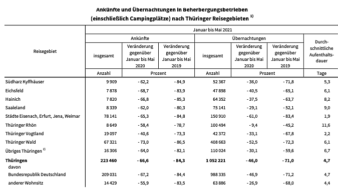Im Mai 2021 wurden nach Mitteilung des Thüringer Landesamtes für Statistik in den Thüringer Beherbergungsstätten (mit 10 und mehr Betten) und auf Campingplätzen (ohne Dauercamping) insge-amt 55,4 Tausend Gästeankünfte und 244,8 Tausend Übernachtungen gezählt...