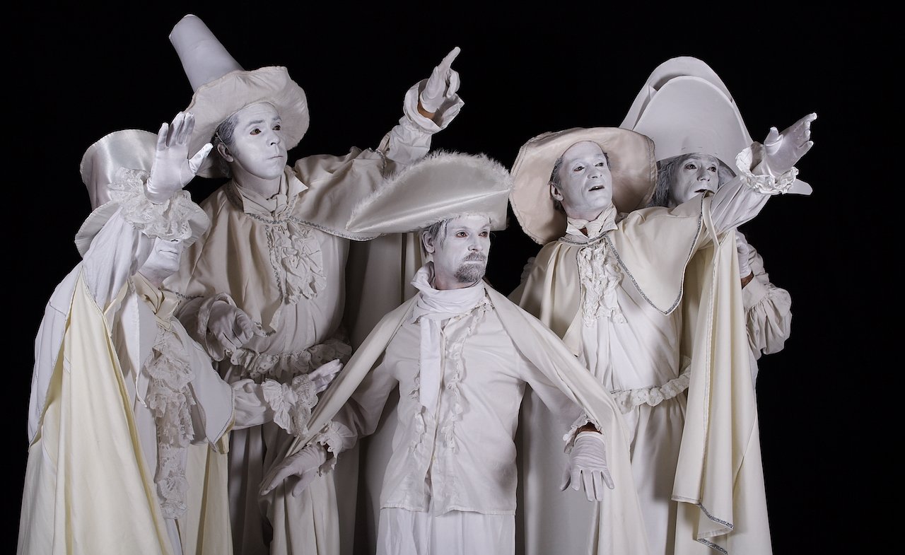 Aktionstheater Kamaduka als "Weiße Gentlemen": Wie Reisende sind sie den Engeln gleich: Durchqueren endlose Räume, finden sich urplötzlich ein. (Foto: Agentur)