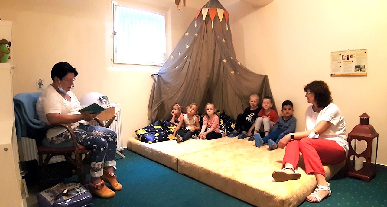 Jeden Dienstag von 10:00 bis 11:00 Uhr besucht Frau Blancke die Kita-Kinder und erfreut sie mit Märchen und spannenden Geschichten. Zur ersten Lesung verfolgten 14 Jungen und Mädchen im Alter von drei bis fünf Jahren in der Kinderbibliothek der Kita Pusteblume die spannenden Geschichte. Sie hörten das Märchen vom Rotkäppchen".