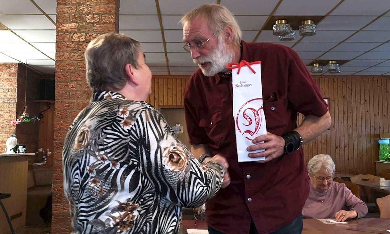 Christa Groß bedankte sich bei Olaf Schimmelpfennig für die vielen schönen Eindrücke und Berichte mit einem kleinen Geschenk (Foto: T. Leipold)