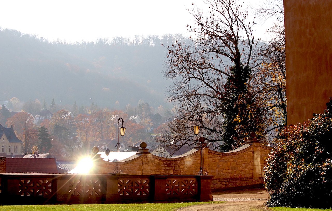 Das Foto zeigt eine wunderschöne Mittagssonne auf dem Sondershäuser Schloss mit dem Blick auf die Stadt.