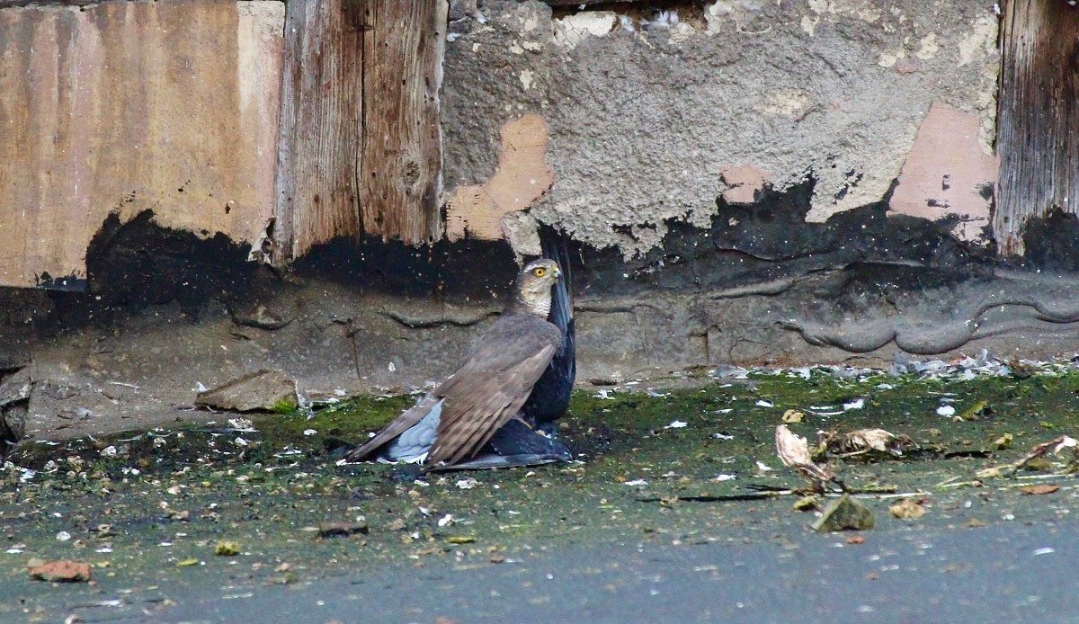 Bei unserem Foto des Tages handelt es sich um einen Habicht, der eine Taube erlegt. Er jagt fast täglich in seinem Revier. Für taubenreiche Innenstädte ist das sicher ein Segen. Für mache Bewohnerinnen und Bewohner, besonders für Taubenliebhaber eher ein Graus.