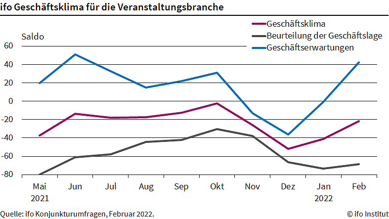 Das Geschäftsklima für die Veranstaltungswirtschaft hat sich spürbar verbessert. Der entsprechende Wert der Branche lag im Februar bei minus 21,6 Punkten. Im Januar waren es noch minus 41,1 Punkte gewesen...
