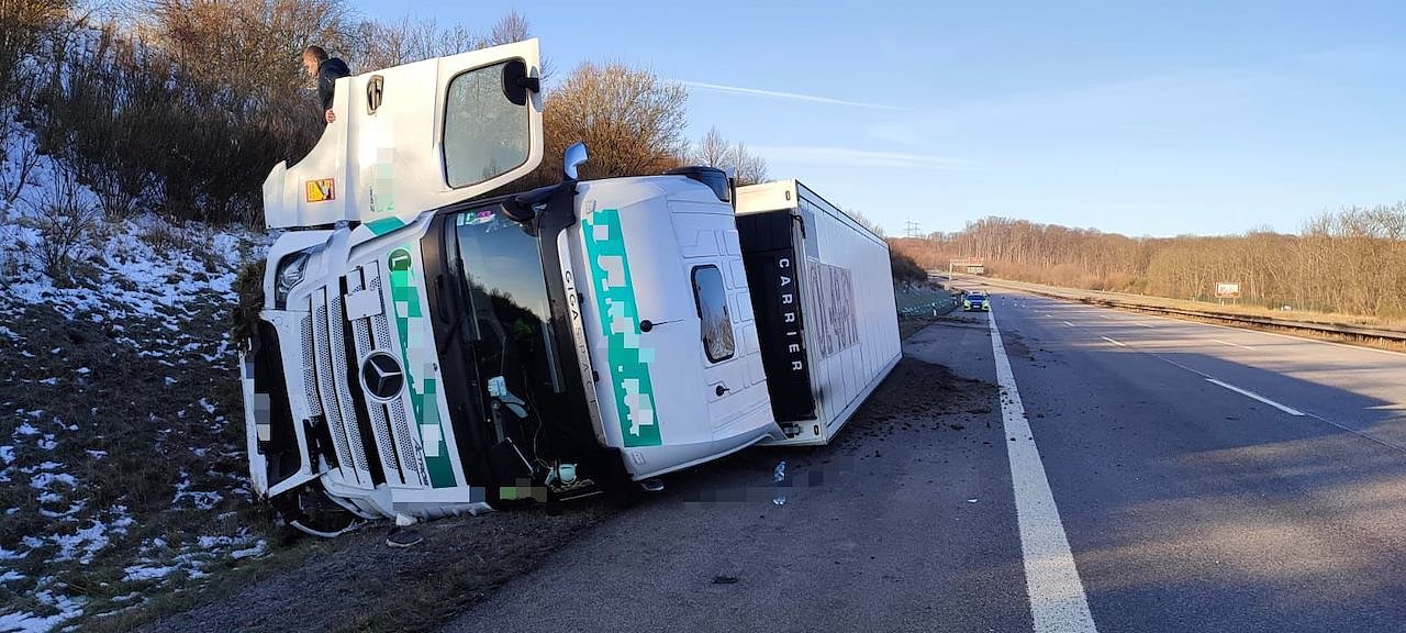 Aufgrund der Ablenkung kam der Sattelzug allmählich nach rechts von der Fahrbahn ab und durchfuhr ca. 100 Meter den angrenzenden Straßengraben. Schlussendlich kippte der Sattelzug auf die Fahrerseite um und kam so zum Liegen. Dabei riss an der Sattelzugmaschine des Mercedes der Dieseltank auf und verunreinigte das angrenzende Erdreich durch austretenden Dieselkraftstoff. Beide Fahrzeuginsassen blieben bei dem Unfall unverletzt.
