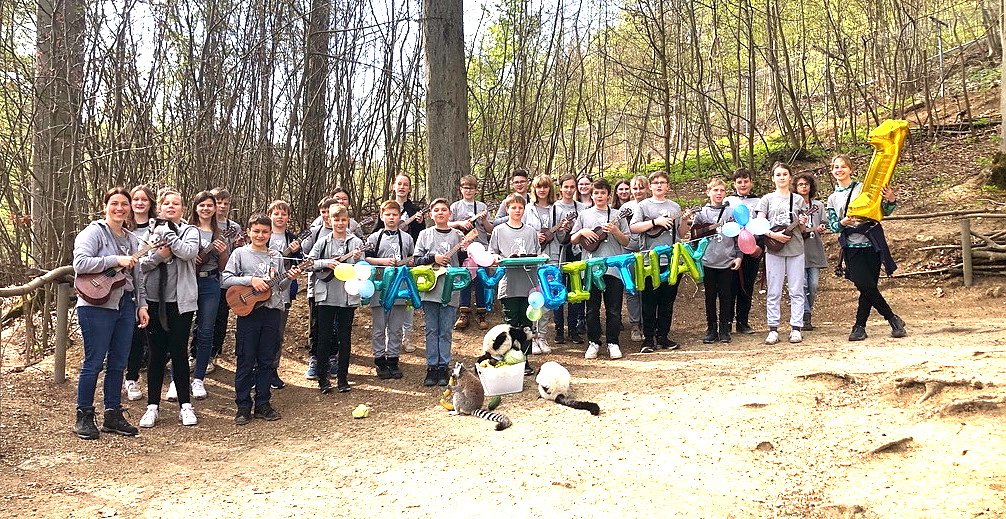 Die Kinder verliebten sich sofort in das Fellknäuel und man hat kurzerhand die Patenschaft für das Tier übernommen. Im April wurde Floyd 1 Jahr alt und die Schulkasse kam zur Geburtstagsparty in den Affenwald. Mit ihren Ukulelen stimmte die Klasse das Lied "Happy Birthday" an. Als Geschenk gab es einen riesigen Obst- und Gemüsekorb. Nicht nur Floyd sondern auch alle anderen Affen ließen es sich nicht nehmen die Geschenke ordentlich zu "pündern".