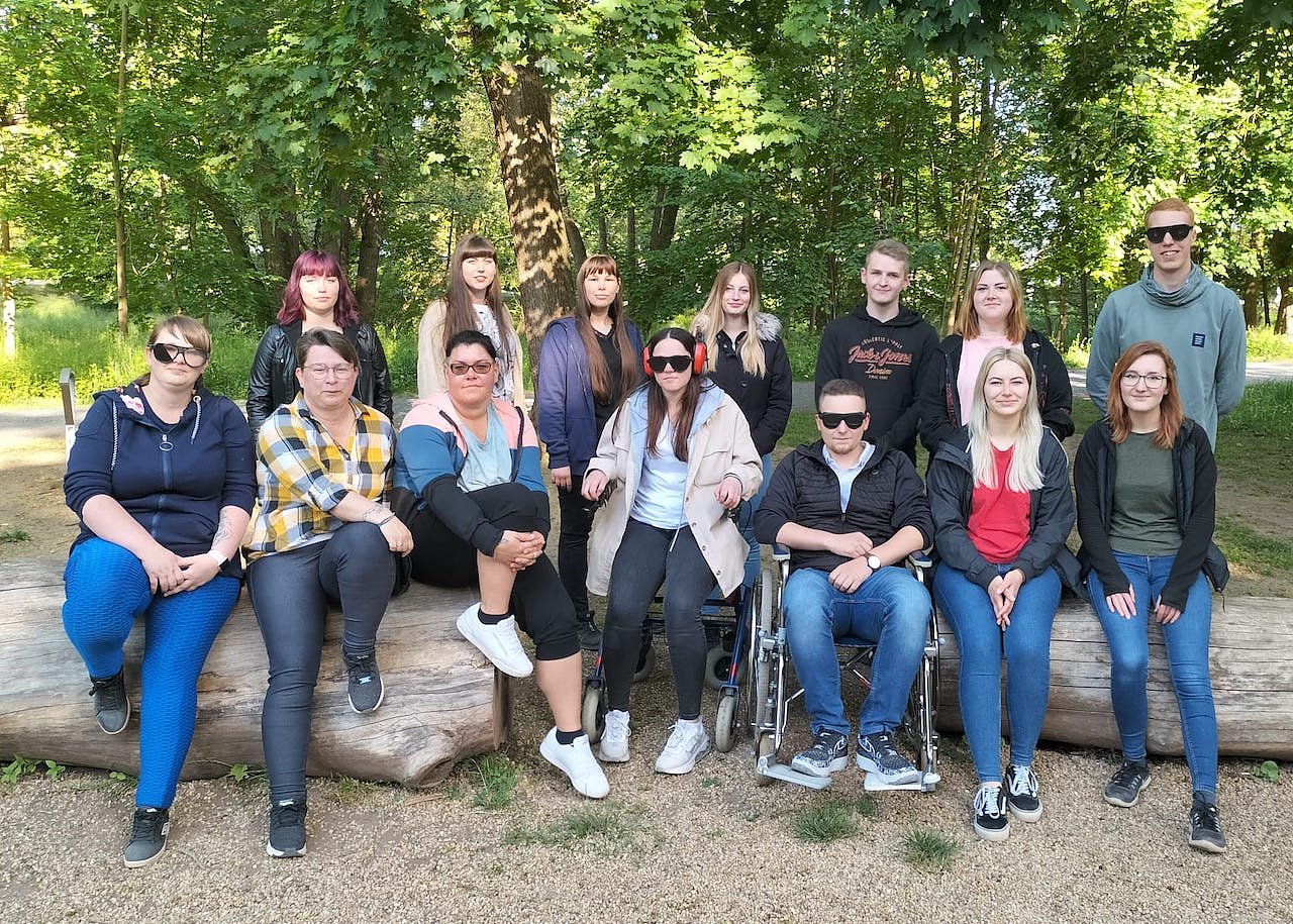 Eine spezielle Brille trübt den Blick, Ohrenschützer machen das Hören schwer. Nur langsam kommen sie im Stadtpark mit Rollstuhl und Unterarmgehstützen voran. Und anstrengend ist es außerdem, mit eingeschränktem Sichtfeld und Schwerhörigkeit, den Gesprächen der Mitschüler zu folgen...