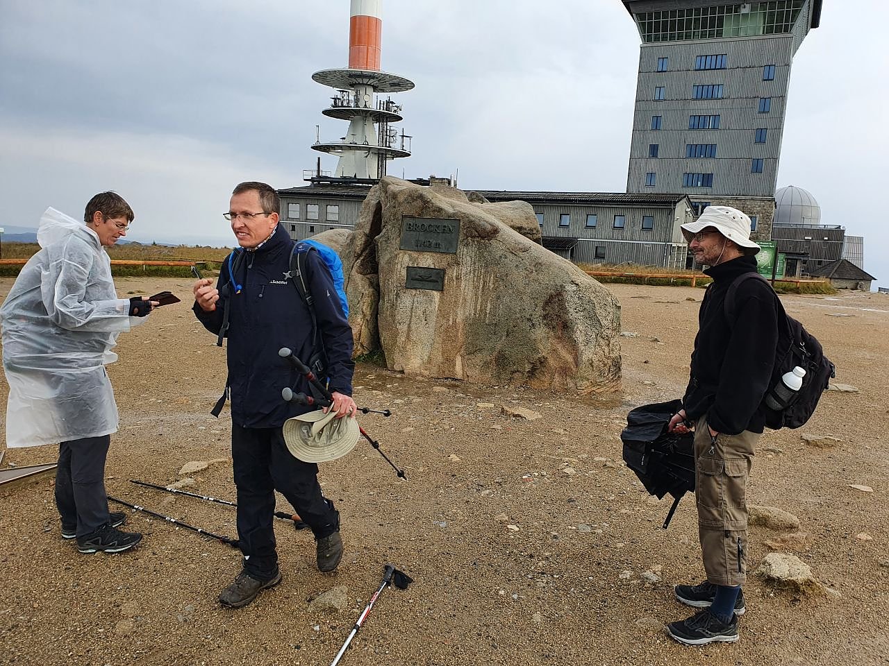 Wer den Brockengipfel für sich allein haben will, der wandere bei strömendem Regen hinauf und sei spätestens 8 Uhr oben. Das erste Drittel der Harzquerung von West nach Ost ist nach 46 Kilometern auf dem höchsten Harzgipfel geschafft; V.l.n.r. Antje Otte-Hartig, Lutz Hollerbuhl, Dr. Christian Richter. (Foto: B. Schwarzberg)