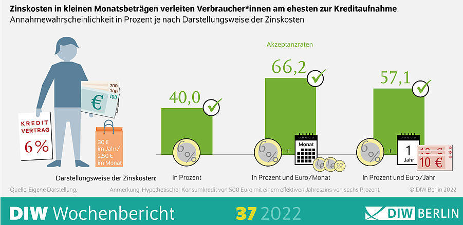 Zudem lassen sich Menschen einfacher von einem Kredit überzeugen, wenn dessen Kosten nicht nur prozentual angeben werden, sondern auch in Monatsbeträgen. Dies sind die zentralen Ergebnisse einer Untersuchung von Wissenschaftler*innen des Deutschen Instituts für Wirtschaftsforschung (DIW Berlin), für die mehr als 1000 Menschen in Deutschland online befragt wurden.