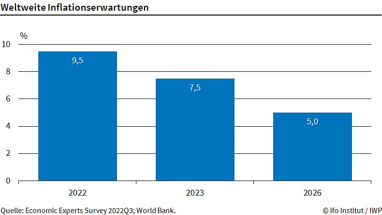 Autor: redIhre Inflationserwartungen für 2022 sind im Vergleich zum zweiten Quartal noch einmal deutlich um 1,8 Prozentpunkte gestiegen, sagt ifo-Forscher Niklas Potrafke. Auch für die kommenden Jahre sehen die Teilnehmenden nun höhere Inflationsraten. Für die abgefragten Jahre 2023 und 2026 erwarten sie weltweit 7,5 Prozent und 5,0 Prozent.