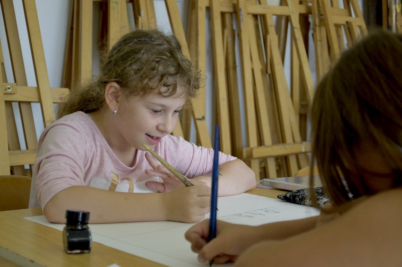 Seit einer Weile werden für Kinder und Jugendliche zwei Kurse angeboten, montags der für die kleineren Kinder und dienstags der für die Jugendlichen. Im Montagskurs wurde im vergangenen Halbjahr mit Feder und Tusche gezeichnet, was für die Kleinen ungewohnt und eine Geduldsprobe war. Wie schon vor ein paar Jahren sollten die Kinder immer paarweise ein Bild zusammen entwickeln, ein sogenanntes Rundherumbild, das immer wieder gedreht wurde und dann mussten sie an der nächsten Seite weiter zeichnen.