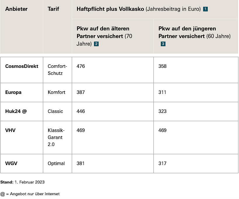 Im Modellfall versichert ein Paar den gemeinsamen Pkw auf die 70-jährige Halterin (linke Spalte) oder den 60-jährigen Partner (rechte Spalte). Die ausgewählten Tarife bieten von uns in unseren letzten Tests (Finanztest 11/2022 und 12/2022) empfohlene Leistungen und sind im Schnitt günstig in Haftpflicht und Vollkasko für 70-jährige Modellkunden, die in einem Ort mit mittlerer Regionalklasse wohnen.