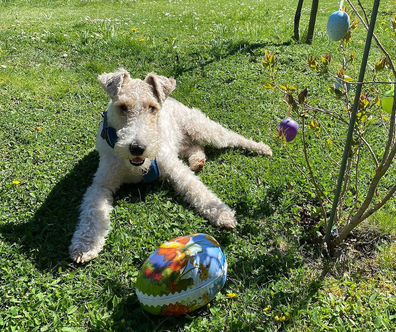 Autor: emwFrau Marleen Biering nahm ihren Hund vor österlicher Gartenkulisse auf.