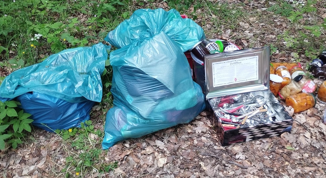 Im Wald die Panzerstraße entlang, auf der linken Seite, liegt wieder einmal Müll. Ob es sich um Diebesgut handelt oder jemand aus reiner Bequemlichkeit seinen Dreck in die Natur entsorgt hat, man weiß es nicht.