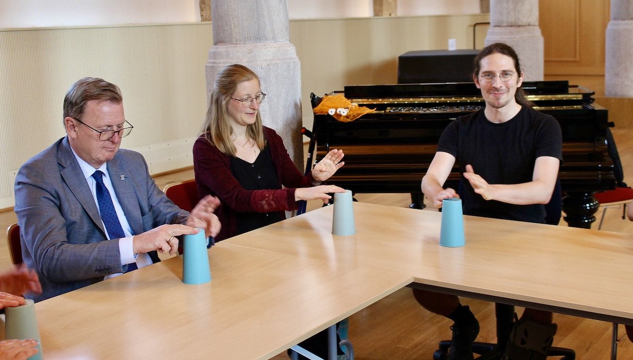 Bodo Ramelow, Landrätin Antje Hochwind-Schneider, Bürgermeister Steffen Grimm, Geschäftsführerin der Landesmusikakademie Martina Langenberger und weitere geladene Gäste, beteiligten sich an einem rhythmischen Becher-Percussion-Spiel.