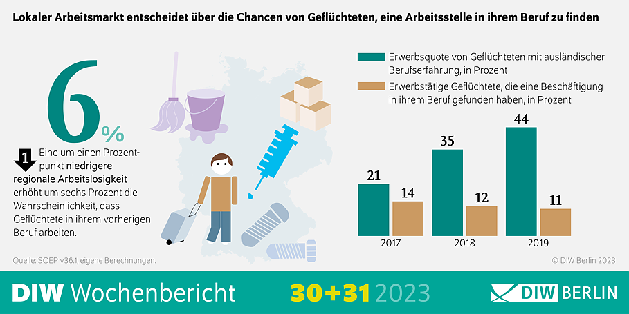 Geflüchtete haben jedoch größere Chancen, auch hierzulande in ihrem Beruf zu arbeiten, wenn eine geringe Arbeitslosigkeit an dem ihnen staatlich zugewiesenen Wohnort herrscht, ergibt eine Studie von Wissenschaftlern des Deutschen Instituts für Wirtschaftsforschung (DIW Berlin) und der Universität Bielefeld...