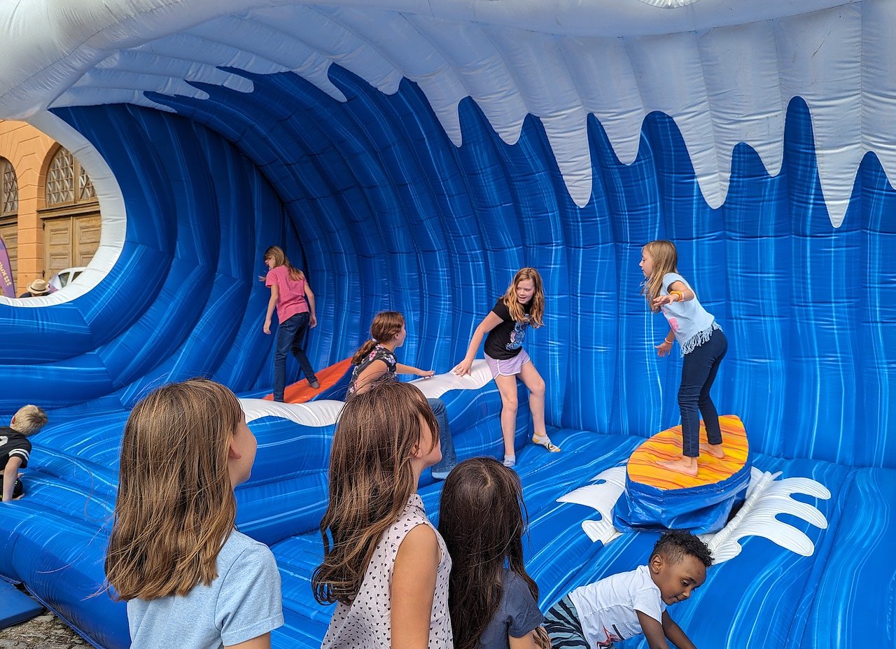 Das Kinder- und Jugendmusikfestival bot für jedes Alter viele Möglichkeiten, sich musikalisch auszuprobieren oder einfach nur den Weltkindertag zu genießen. So war die Chill-Out-Area im Schlosshof immer besetzt, genauso wie der Surf-Simulator, die Riesenmalwand, die verschiedenen Hüpfburgen, das T-Wall Reaktionsspiel, die Stationen des Wassermusikorchesters, die Fotobox, die Bastelstände oder der Virtual Reality Stuhl im Schloss.