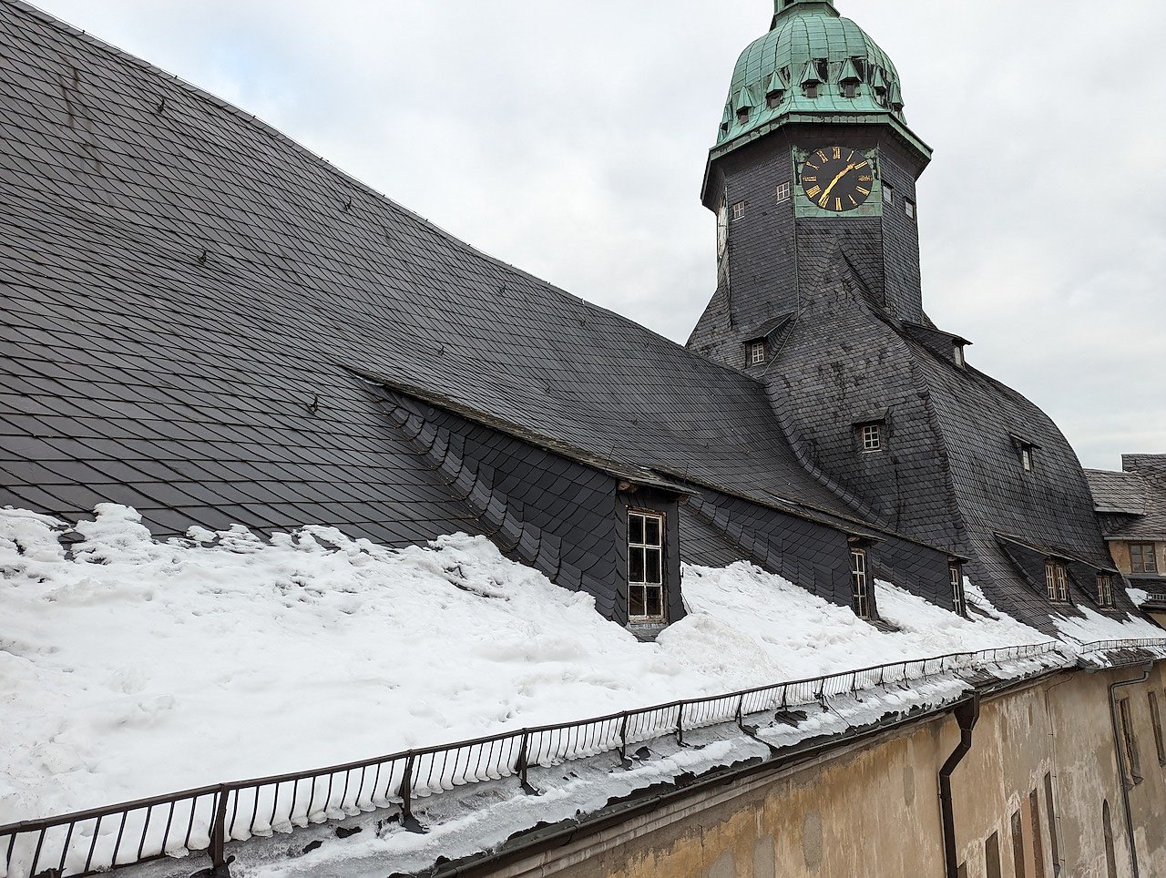 Am Donnerstag kam die Freiwillige Feuerwehr zu Hilfe. Mit einer Drehleiter machten sich Bürgermeister Steffen Grimm, Mitarbeiter der Feuerwehr und Verantwortliche der Stadtverwaltung selbst ein Bild von der Lage auf dem Schlossdach. Entlang des gesamten Nordflügels hatte sich im Laufe der vergangenen Tage eine dicke Eisschicht gebildet, die droht, vom Dach zu kommen. Dahinter türmte sich im Schneefang eine gefrorene Schneeschicht. Wir bedauern den Ausfall der Eisbahn sehr, aber die Sicherheit geht vor und steht über allem, sagte Bürgermeister Steffen Grimm.