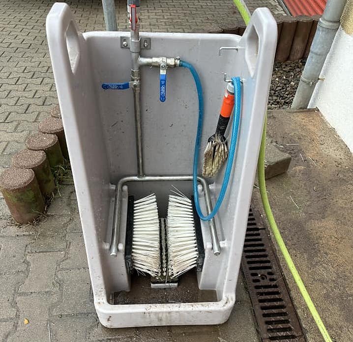 Auf Facebook echauffiert sich wegen der gestern entstandenen Fotos zum Beispiel der AfD-Politiker Daniel Roi, der für seine Partei im Magdeburger Landtag sitzt: Inzwischen gibt es nicht nur dieses Foto (unser Titelfoto - die Red.), das sicher vor dem Arbeitseinsatz entstanden sein muss, denn die Stiefel sind hier noch sauber. Aber wo gibt es schon Bier vor dem Einsatz? Wie dem aus sei, das Smartphone war jedenfalls dabei. Doch auch diese Behauptung ist leicht zu entkräften, wie unser nächstes Foto zeigt: eine Stiefelwaschanlage durch die alle Helfer nach einem Einsatz gehen müssen, ehe sie die Aufenthaltsräume der Feuerwehr in Berga betreten dürfen. Das kritisierte Foto entstand also erst nach dem Einsatz.