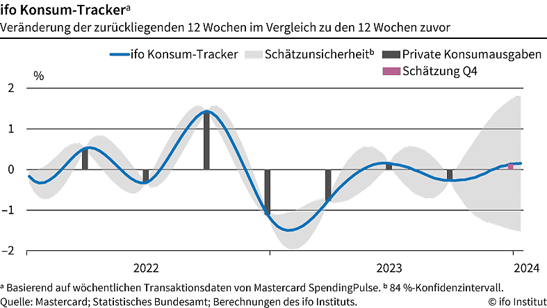 Die bis Mitte Januar vorliegenden Daten (Kreditkarten, Debitkarten, Bargeld) aus der Mastercard-SpendingPulse-Datenbank zeigen bereits seit der Adventszeit eine Zunahme der preisbereinigten Umsätze im Einzelhandel und im Gastgewerbe an. Nach Schätzung des ifo Instituts hat der private Konsum am Jahresende 2023 sogar leicht zugelegt. Auch für das erste Quartal 2024 deutet sich ein weiterer Anstieg an. Hier dürfte sich das Wiedererstarken der Kaufkraft bemerkbar machen, da mittlerweile die Einkommen der privaten Haushalte stärker steigen als die Preise”, ergänzt Wollmershäuser.
