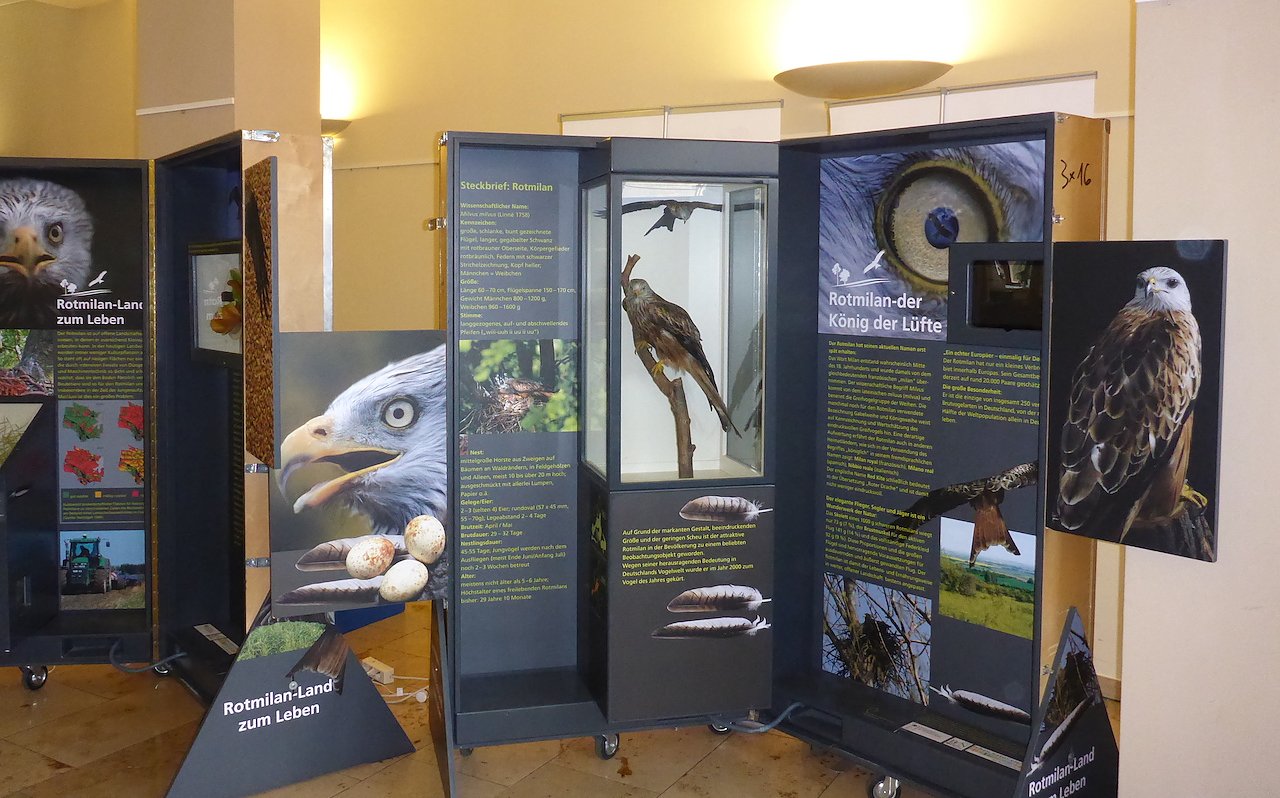 Über die Möglichkeiten zu rotmilanfreundlicher Landbewirtschaftung und andere Maßnahmen zum Schutz des Rotmilans berichtet die Ausstellung des Projektes Rotmilan - Land zum Leben.