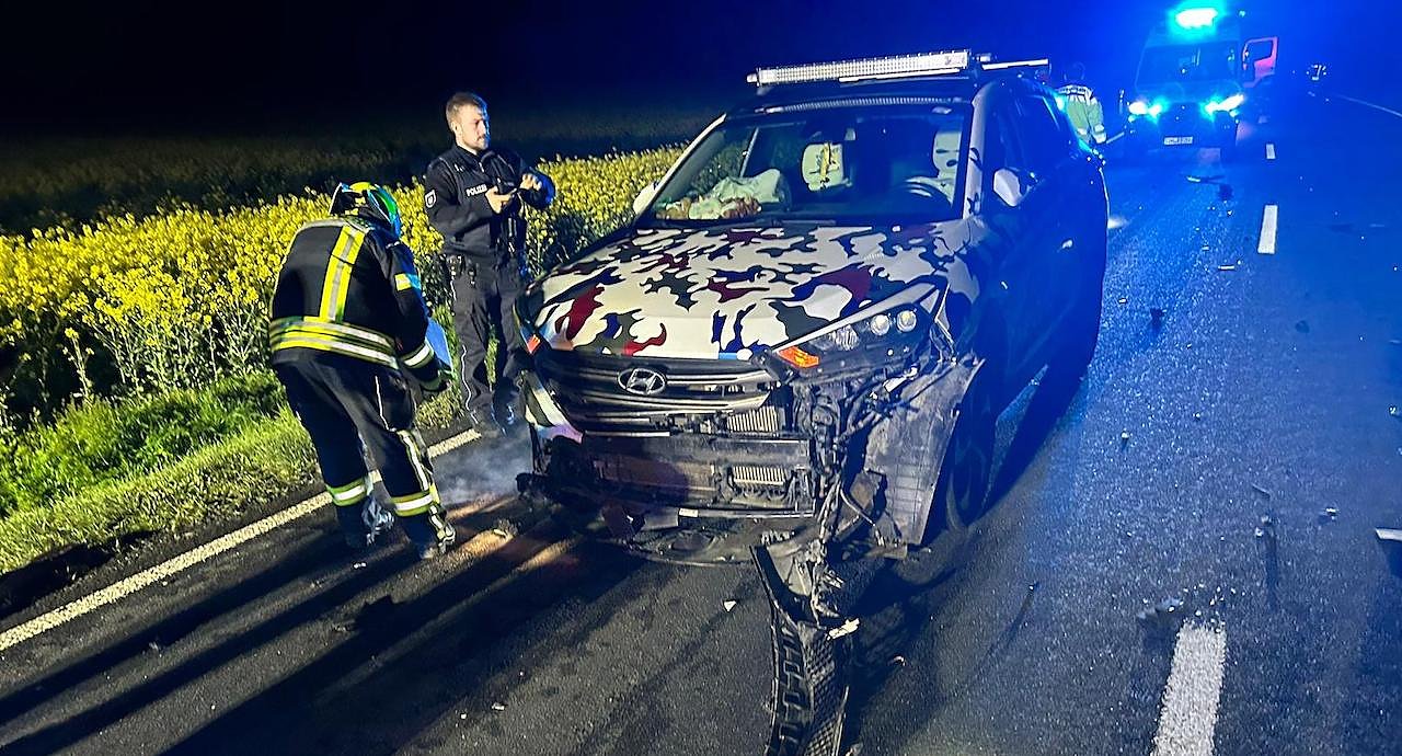 Der Fahrzeugführer konnte die Kollision nicht mehr verhindern. Beide Tiere verendeten noch an der Unfallstelle. Der Fahrzeugführer erlitt leichte Verletzungen und wurde vor Ort durch Rettungskräfte ambulant versorgt. Am Fahrzeug entstand Sachschaden. Kameraden der Feuerwehr kamen ebenfalls zum Einsatz.