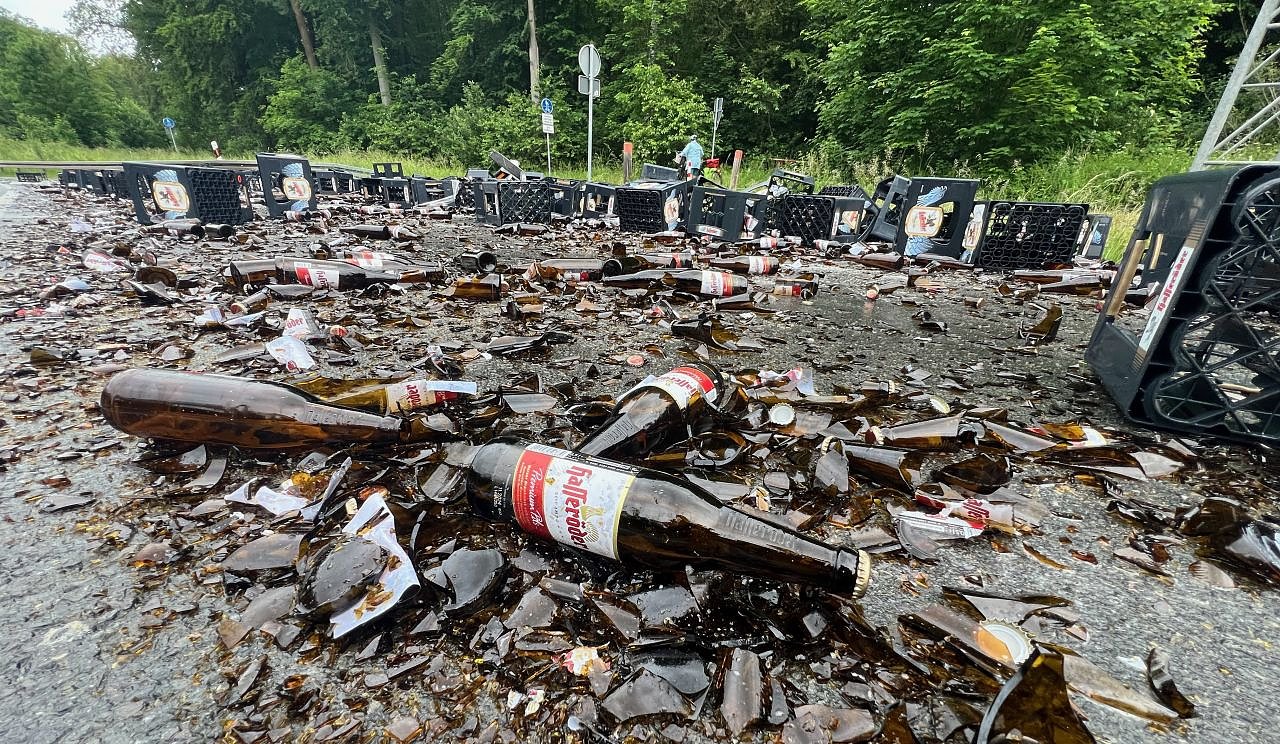 Autor: redHier schaukelte sich der Auflieger auf, die Ladung verrutschte. Die Plane konnte dem Gewicht nicht standhalten, und so stürzten rund 150 volle Bierkästen auf die Bundesstraße.