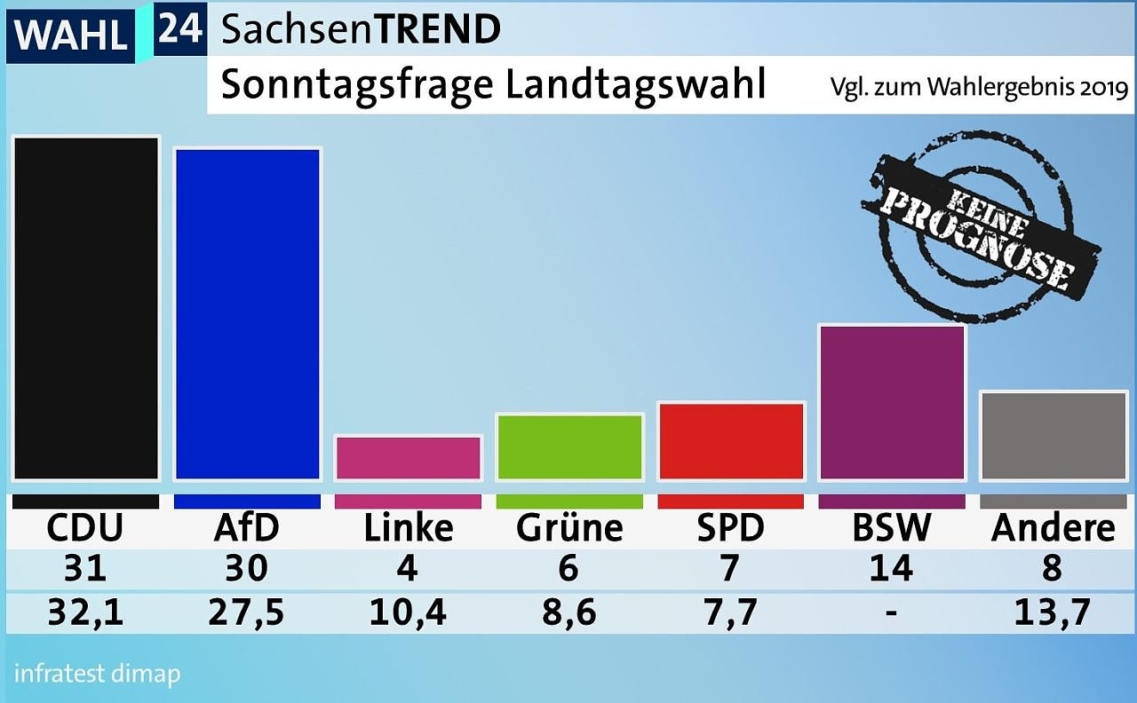Bei einem Wahlausgang am 1. September entsprechend dieser Sonntagsfrage wäre eine Mehrheit für das amtierende Regierungsbündnis aktuell ungewiss. Als rechnerische Alternative bliebe der CDU, abgesehen vom politisch ausgeschlossenen Bündnis mit der AfD, allein eine Koalition mit dem BSW.