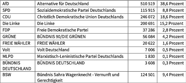 Das Wahlergebnis in Thüringen ist m.E. in erster Linie auf den Friedenswillen der Bürger und den wirtschaftlichen Niedergang, hervorgerufen durch die Unfähigkeit der "Ampel-Regierung," zurückzuführen. Weiterhin durch die Hilflosigkeit des Staates, wirksam gegen die Verbrechen durch "Zugewanderte" vorzugehen. Ich stelle aber auch immer wieder fest, dass die Bürger in Westdeutschland leichter zu manipulieren sind. Wenn das nicht so wäre, hätte die CDU, welche eine für mich zum Nutzen des Kapitals gefährliche Kriegspolitik betreibt, nicht so viele Stimmen bekommen. Natürlich spielt auch der über Jahrhunderte eingetrichterte christliche Glaube eine Rolle, den "Pfaffenparteien" die Treue zu halten. "Gott sei Dank"sind wir in der DDR davon weitgehend verschont geblieben !