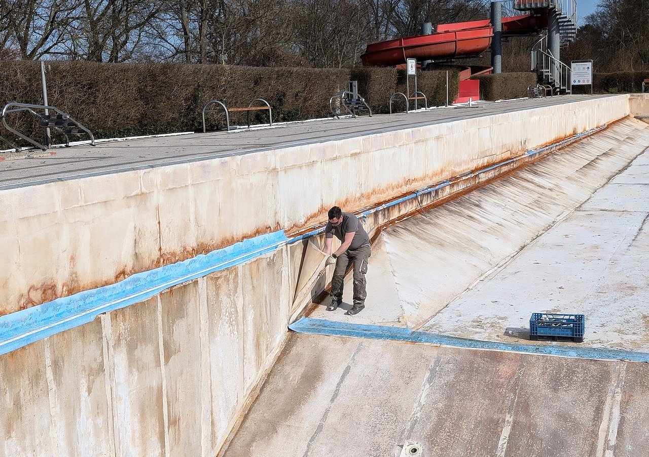 In den vergangenen zwei Wochen wurde nun die komplette Beckenfolie aus dem Hauptbecken entfernt und entsorgt. Die alte Beckenfolie hatte eine Lebensdauer von 25 Jahren. Aktuell sind die Mitarbeiter des Bauhofes dabei, Oberflächen im alten Betonbecken auszubessern sowie die Becken mit dem Hochdruckreiniger von Schmutz zu befreien. Erst dann kann in den kommenden zwei Wochen die neue Beckenfolie fachgerecht verlegt werden.