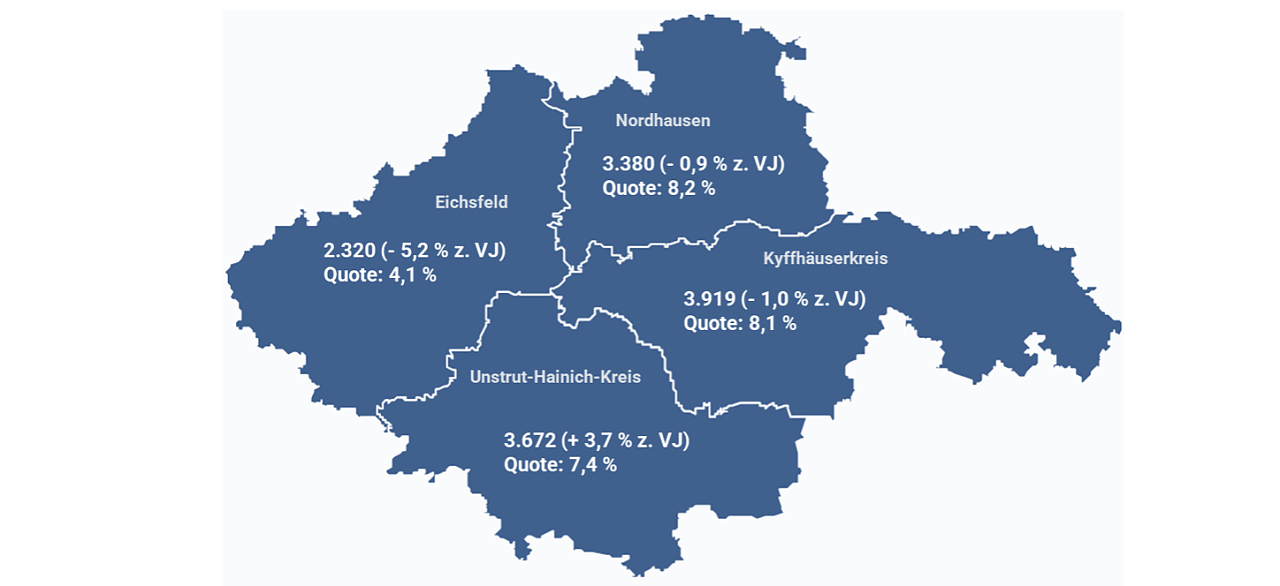 Die Arbeitslosigkeit ist Kyffhäuserkreis im Juni 2025 gesunken. 2.919 Menschen waren arbeitslos gemeldet, 84 Personen weniger (-3 Prozent) als im Mai und 29 Personen bzw. 1 Prozent weniger als vor einem Jahr. Die Arbeitslosenquote betrug 8,1 Prozent. Vor einem Jahr lag sie ebenfalls bei 8,1 Prozent.