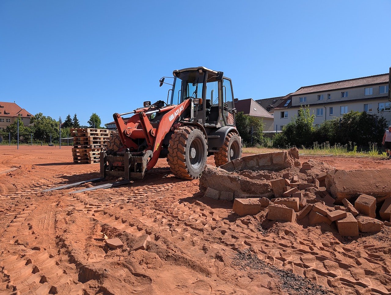 Seit heute wird der alte Tennenbelag abgetragen und entsorgt. Damit endet auch die Staubbelastung für die umliegenden Anwohner. Die Mitglieder des Tennisvereins Blau-Weiß Sondershausen hatten sich in der Planungsphase für einen sandverfüllten Kunstrasen entschieden. Dieser soll länger bespielbar und weniger pflegeintensiv sein.