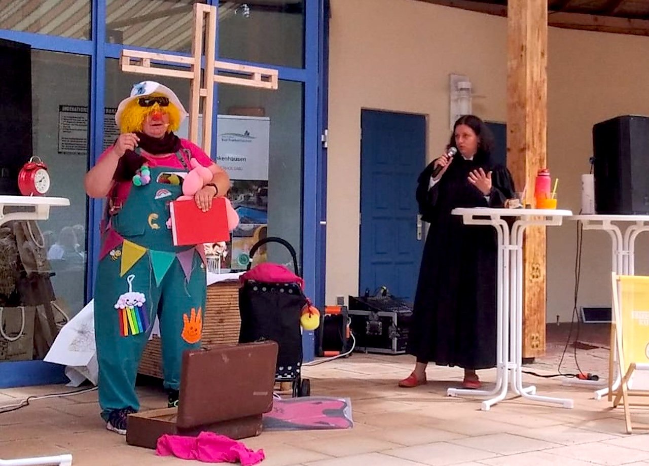 Frau Greifenstein wählte im Rededuell mit ihrem hektisch agierendem Gegenüber eine moderne Version des alten Textes und holte damit den Clown auf ein Normalmaß herunter. Es ist nicht im Urlaub wichtig, an dieses und jenes, an alle vorhandenen Probleme im Privaten und der Welt zu denken, sondern einfach mal bekanntermaßen die Seele baumeln zu lassen. So gab es also noch ein gutes Ende mit den beiden Kontrahenten und eine Auflösung bzgl. des Clowns: Es war nicht das erste Mal, dass Superintendentin Steffi Wiegleb in dieser Verkleidung den Menschen Freude bereitete.