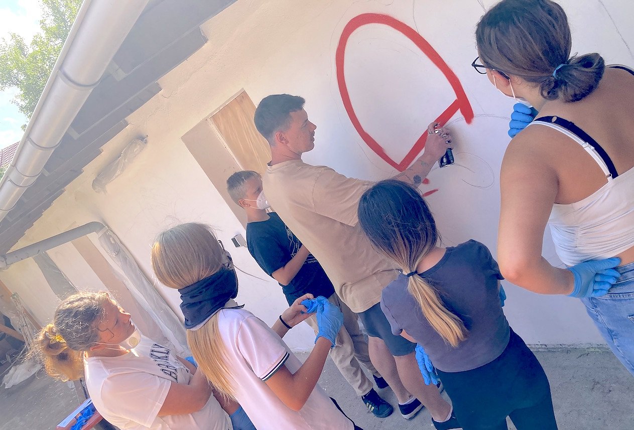 In einem demokratischen Abstimmungsprozess wurde dann aus jedem Skizzenblatt ein Motiv jedes Teilnehmers ausgewählt, welches Final an die Wand gesprüht werden soll. Das entsprechende Wissen und die Techniken des Graffitisprühens zeigte im Anschluss Mathieu, der den Kindern und Jugendlichen immer mit Rat und Tat zur Seite stand.
