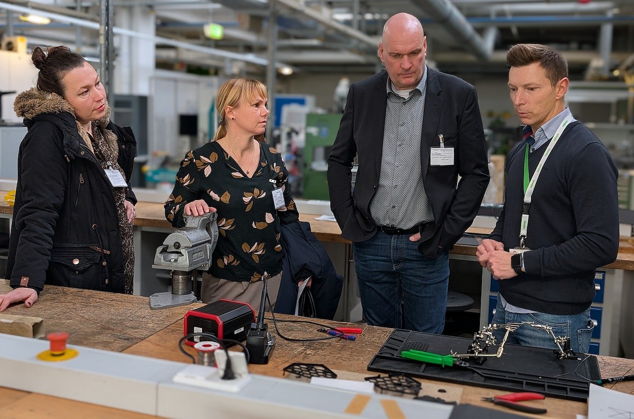 Ausbildungsleiter Marcel Matschke (re.) führte Claudia Langhammer, Stabsstellenleiterin für Kultur, Tourismus & Wirtschaftsförderung (li.), Katrin Kilian, Mitarbeiterin der Wirtschaftsförderung der Stadt Sondershausen (2.v.li.), und Bürgermeister Steffen Grimm (2.v.re.) durch die Ausbildungswerkstatt bei WAGO (Foto: Janine Skara)